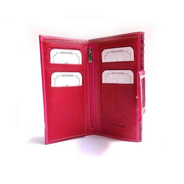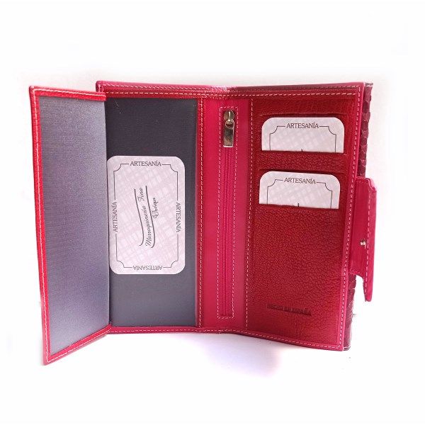 Cartera de mujer de tamaño grande de la colección de Nilo. Cartera con monedero doble separado por bolsillo con cremallera. Billetero con 10 ranuras para tarjetas, cremallera centrol, 2 espacios de fundas transparentes y billetero trasero. Piel vacuno natural, hidratada y flexible con detalle de print escamado de serpiente.