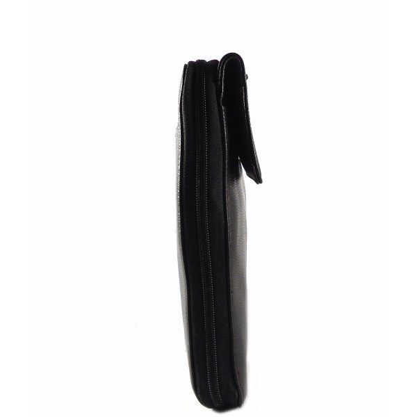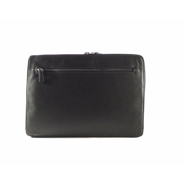 Carpeta de mano de la colección de Hexagona. Piel vacuno natural hidratada y flexible. Doble compartimento: uno con cierre de cremallera y otro con cierre de botón metálico.