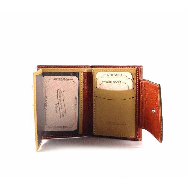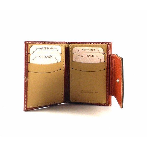 Cartera billetera de tamaño mini (tarjeta) para mujer de la colección de Nilo. Piel vacuno natural hidratada y flexible. Monedero doble. Billetero con 6 tarjeteros y 4 espacios de fundas transparentes.