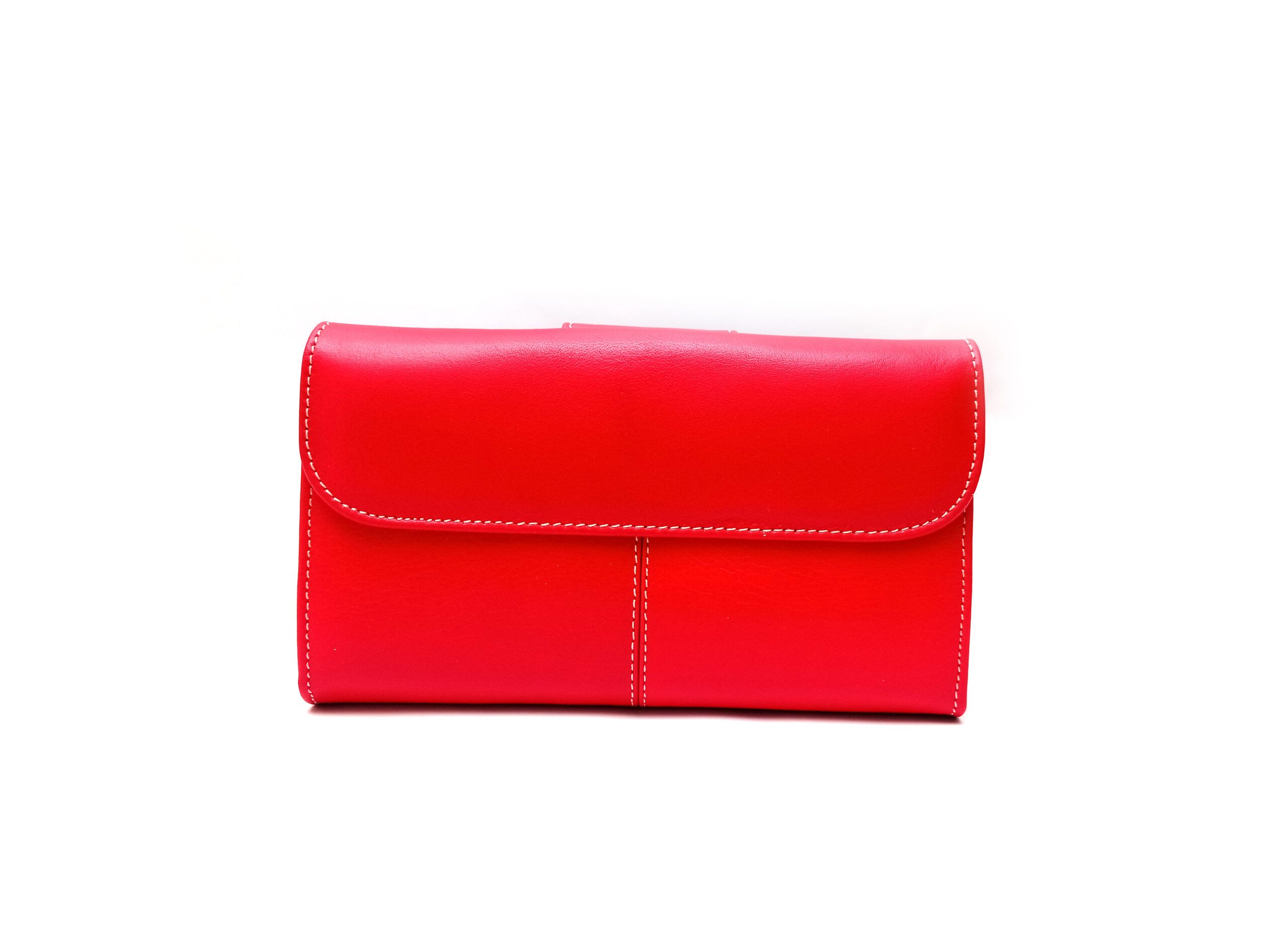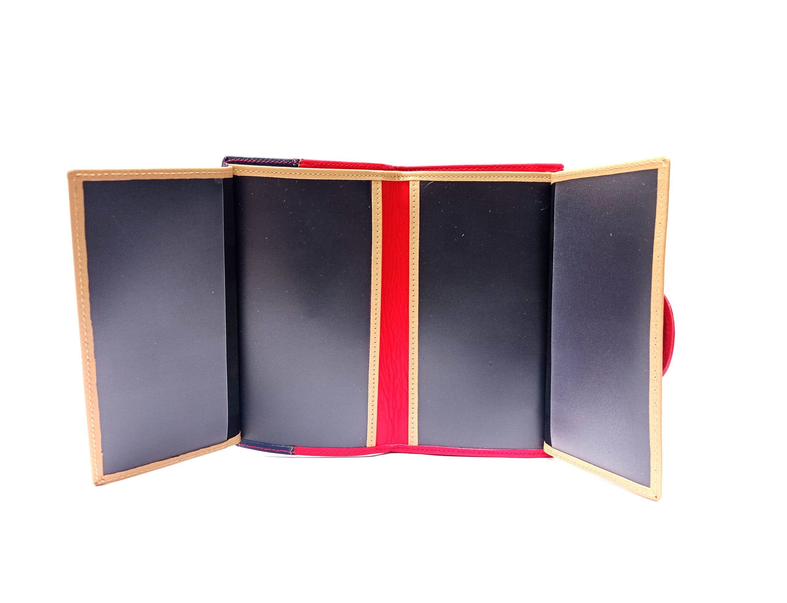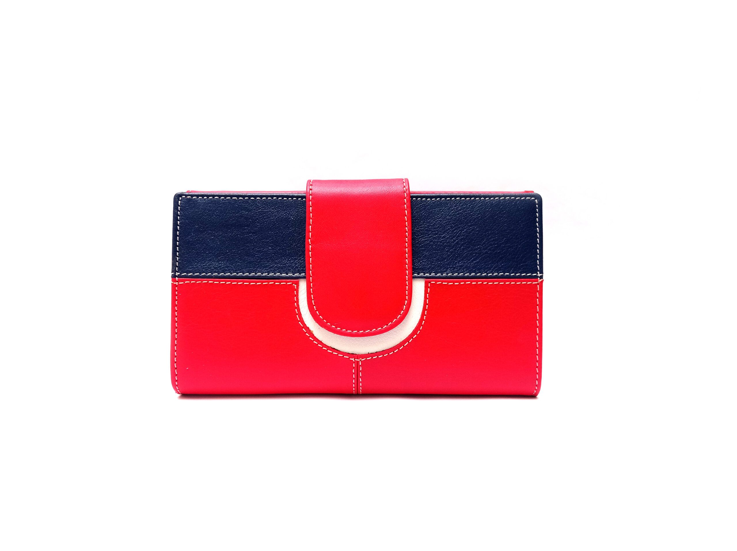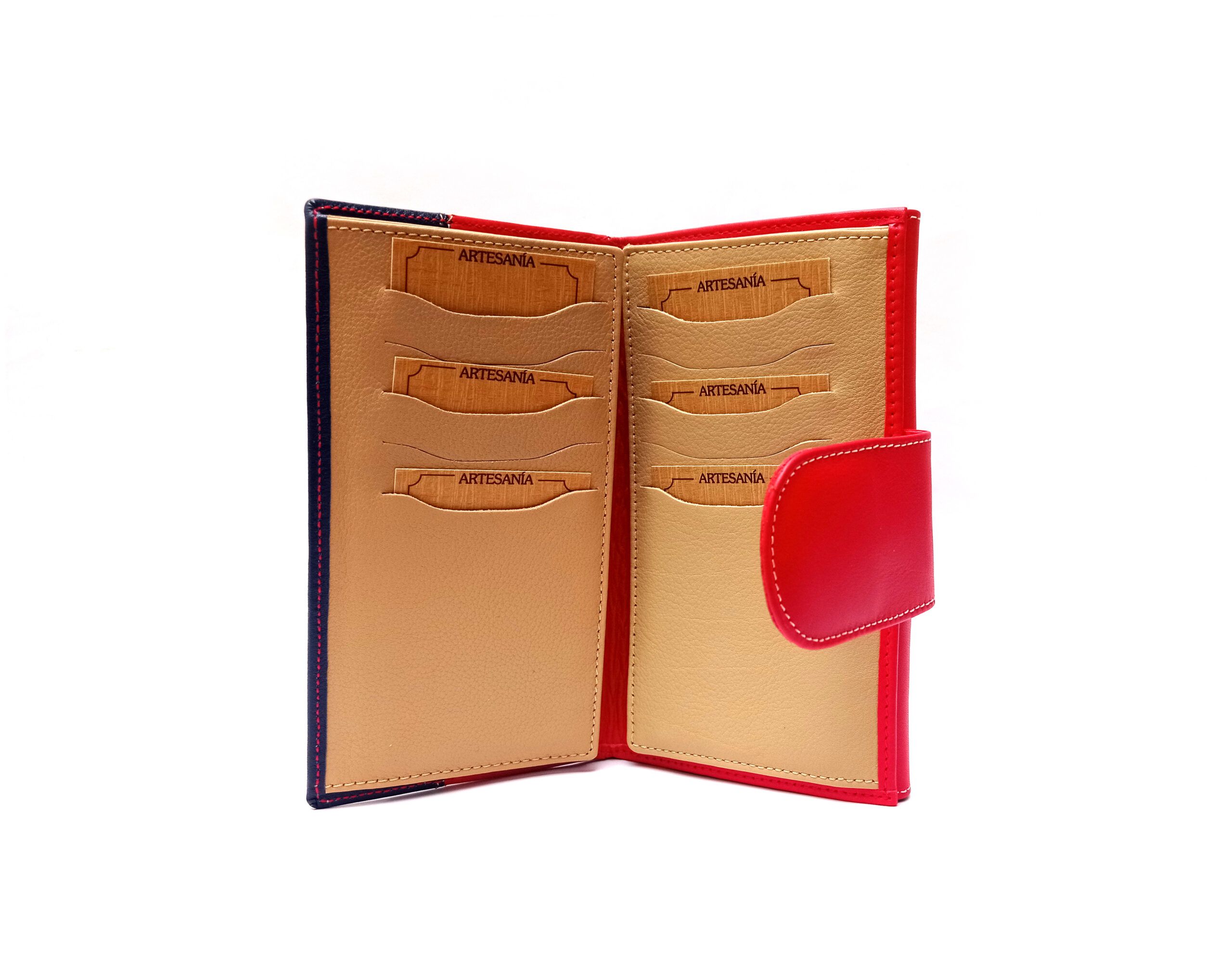 Cartera billetero grande para mujer en piel auténtica rojo y marino combinado.