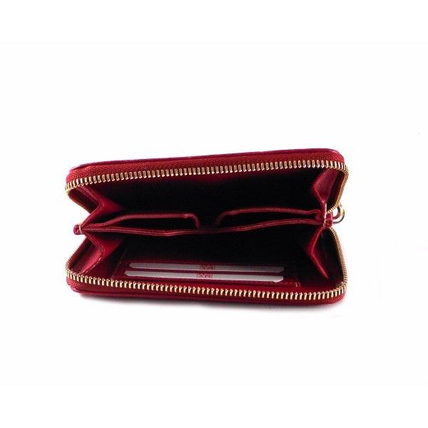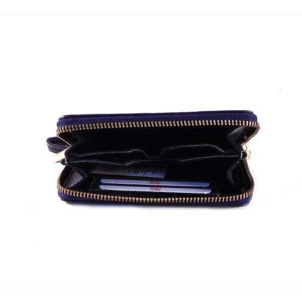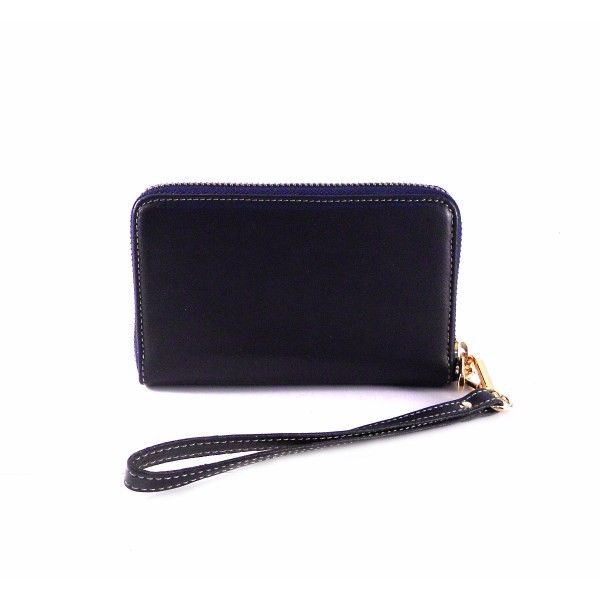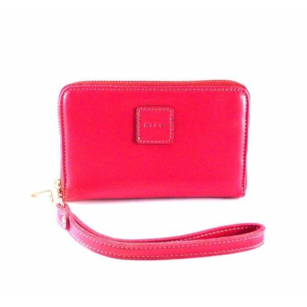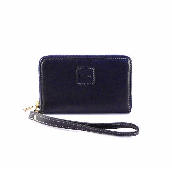 Cartera de la colección de Nilo. Cierre de cremallera dorado.Piel caprina muy fina, hidratada y suave. Muñequera en piel al tono (de quita y pon). 3 tarjeteros interiores, monedero y billetero. Disponible en color azul marino y cereza.