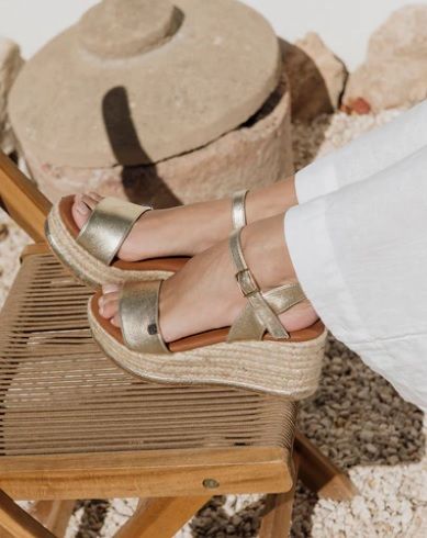 Sandalias de cuña baja de yute de la colección de POPA modelo Arambol en laminado color platino con cierre de hebilla en pulsera al tobillo. Planta en piel acolchada.