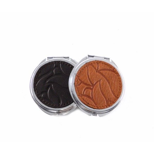 Espejo para bolso en piel de la colección de Nilo. Disponible en color cuero y marrón. Metálico con tapa en piel. Diámetro de 6,5 cm. y grosor de 0,5 cm.