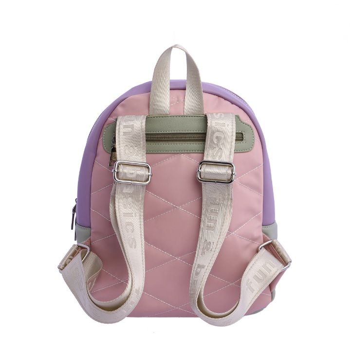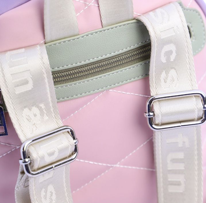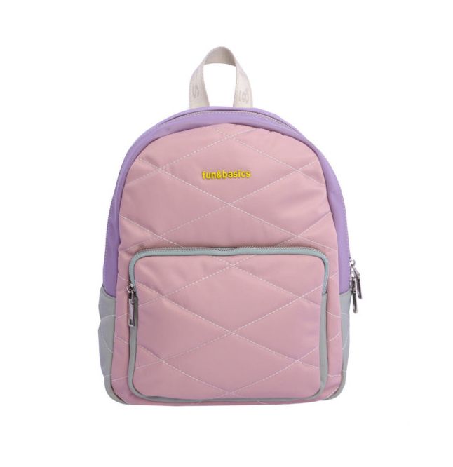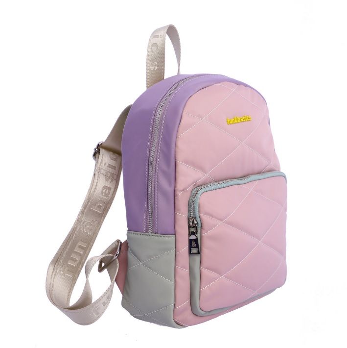 Mochila para mujer de nylon, con asa superior de mano y asas dobles ajustables con logos de la colección de FUN&BASICS. Tiene cierre de cremallera, dispone de tres bolsillos interiores, dos delante y uno detrás con cremallera, más otro exterior detrás también con cremallera. La mochila esta confeccionada en nylon de tres colores pasteles con pespuntes de rombos en color blanco, lleva el logo metálico de la marca en color amarillo y combina a la perfección, los tiradores van personalizados. Interior de poliéster.