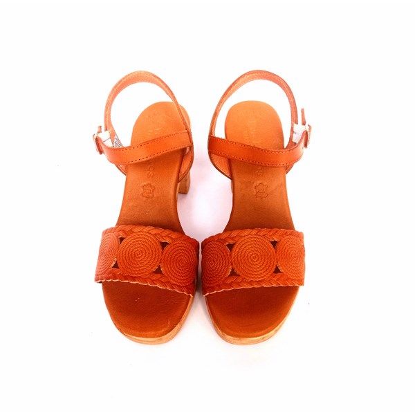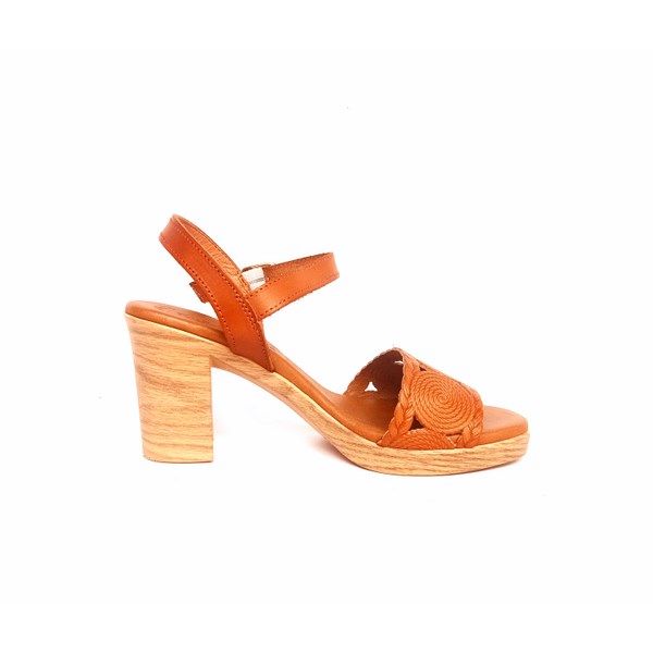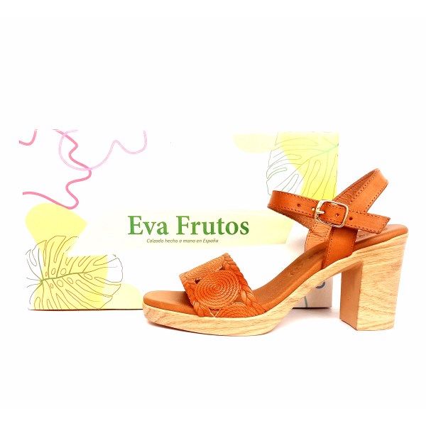 Sandalias de tacón imitación madera de la colección de Eva Frutos. Sandalias fabricadas en piel vaquetilla color cuero muy suaves y adaptables. Sandalias muy ligeras y ergonómicas. Planta en piel acolchada. Tacón de 8,5 cm y piso de 1,5 cm con suela antideslizante.