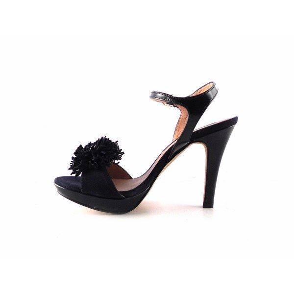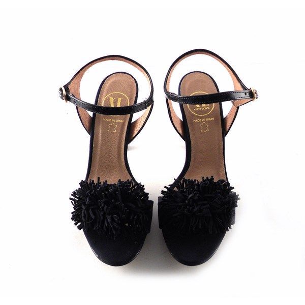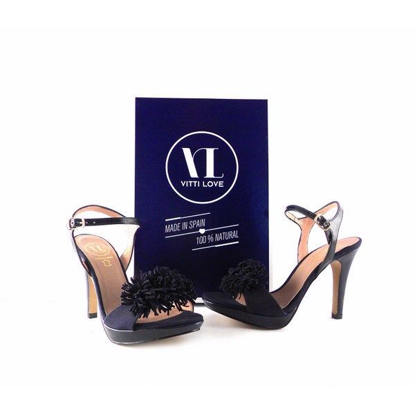 Sandalias de la colección de Vitti Love. Piel vacuno natural hidratada y flexible. Tacón forrado de 10 cm. con plataforma de 2,5 cm.  Pulsera al tobillo con cierre de hebilla lateral. Planta acolchada. Detalle delantero de pompones al tono.