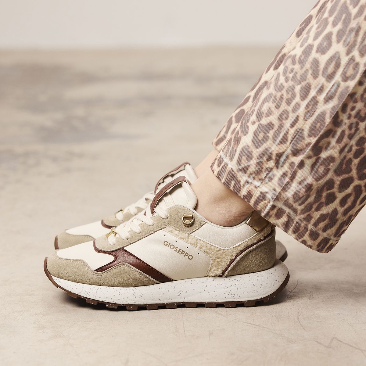 Sneakers para mujer de la colección de GIOSEPPO modelo Copake en color beige con pelo efecto borreguito y acentos metalizados. Cuentan con plantilla anatómica extraíble para garantizar el confort. Los contrastes de colores y tejidos aportan autenticidad al diseño. La hilatura de los tejidos utilizados en la fabricación del forro de este modelo tiene el sello de garantía certificada Global Recycle Standard (GRS).