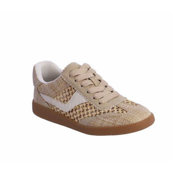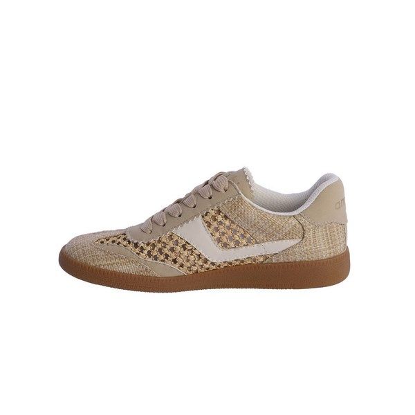 Zapatillas deportivas de la colección AMICHI para mujer modelo Lola. Cierre de cordones. Suela engomada antideslizante. Plantilla acolchada extraible. Material: piel sintética con rafia en color natural.