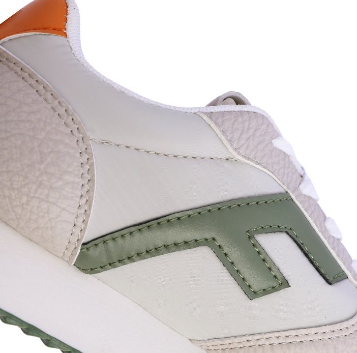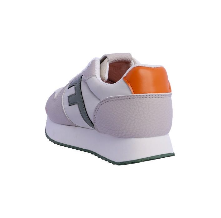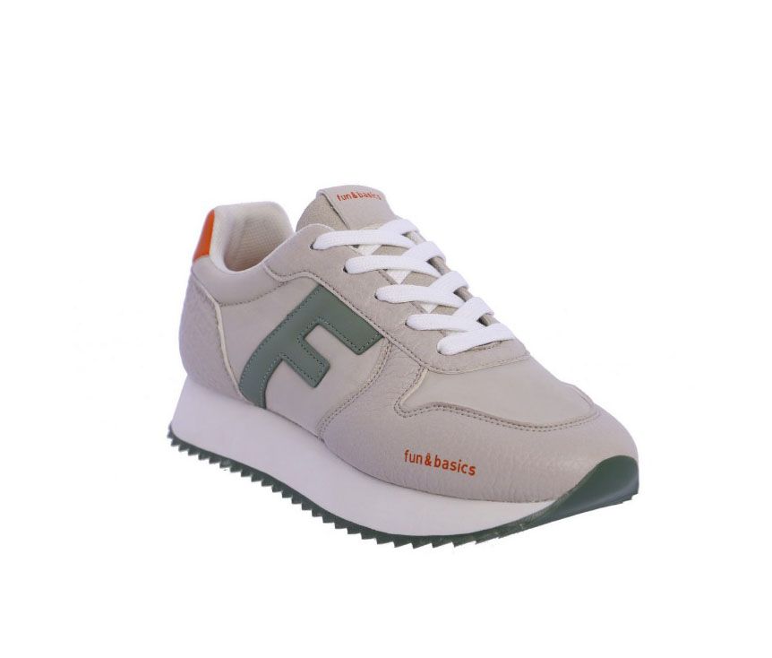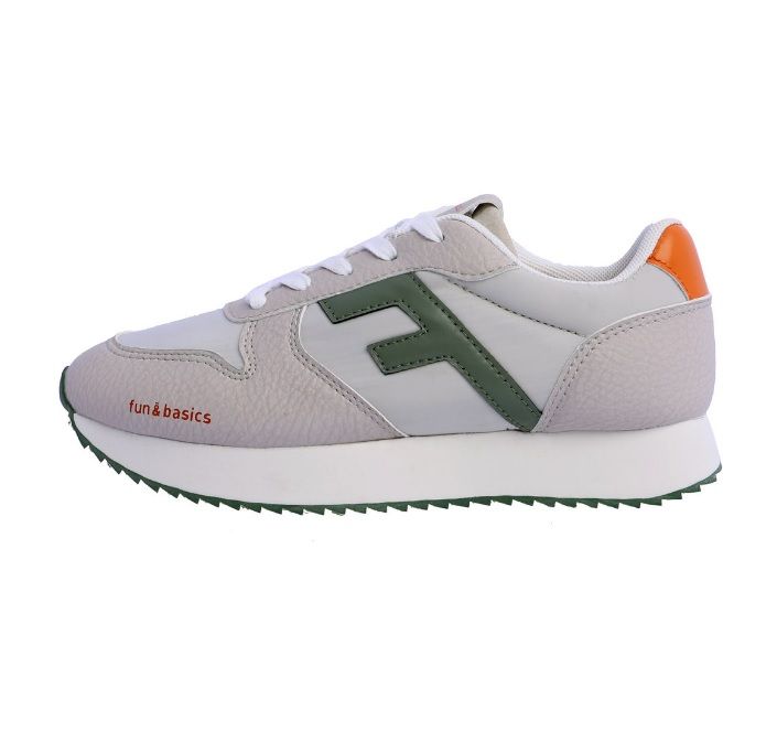 Zapatillas deportivas para mujer de la colección de Fun&Basics. Deportivas con base de nylon y detalles en piel sintética grabada, logos de la marca en verde y naranja, cordones de algodón, forro acolchado y transpirable, piso de TPU.